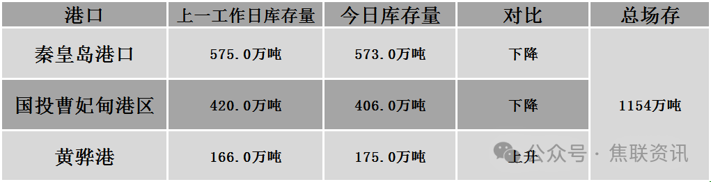 秦皇岛港铁路调入44.5万吨,装船46.5万吨,场存573万吨,锚地煤炭船10艘,预到10艘;国投曹妃甸港铁路调11.8万吨,装船25.5万吨,场存406万吨,锚地煤炭船舶4艘,预到6艘;黄骅港铁路调66.0万吨,装船64.0万吨,场存175万吨,锚地煤炭船舶45艘。