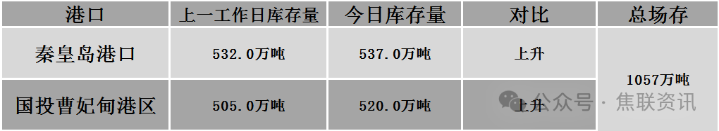 秦皇岛港铁路调入63.6万吨,装船58.6万吨,场存537万吨,锚地煤炭船16艘,预到5艘;国投曹妃甸港铁路调29.4万吨,装船14.5万吨,场存520万吨,锚地煤炭船舶3艘,预到4艘。