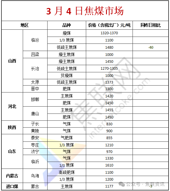 今日国内炼焦煤市场震荡偏弱运行。供应方面,主产地煤矿复产进度持续加快,产能释放较为充分,焦煤市场供应端宽松格局进一步显现。目前多数煤矿生产已恢复至正常水平,但下游需求的复苏节奏明显缓慢,且力度有限,部分煤矿出现库存累积现象,为刺激出货,煤矿报价普遍承压,部分煤种价格继续小幅下调。价格方面,现山西临汾地区低硫主焦煤(A9、S0.5、G85)下调40元至出厂价1480元/吨,主焦煤(A11、S3.5、G92)下调11元至出厂价1103元/吨,瘦主焦煤(A9.5、S0.5、G70)下调50元至出厂价1300元/吨,瘦精煤(A9.3、S0.4、G50)上调89元至出厂价1049元/吨;吕梁地区主焦煤(A11、S2.2、G80)上调5元至出厂价1087元/吨,肥煤(A10.5、S1.5、G90)下调100元至出厂价1300元/吨,1/3焦原煤(S1.5、G70、回收58)上调76元至出厂价611元/吨;长治地区瘦原煤(S3、G60、回收50)下调19元至出厂价645元/吨,贫瘦精煤(A10.5、S0.4、G5)下调30元至出厂价940元/吨,贫瘦原煤(A30、S0.5、G11)下调6元至出厂价637元/吨。需求方面,焦炭市场开启首轮提降,焦企利润空间将进一步被压缩,生产积极性受到一定抑制,对焦煤的采购更趋谨慎,多以严格控制库存、按需小单采购为主。钢厂方面,铁水产量虽有回升,但整体仍处于相对低位,且成材价格表现疲软,钢厂盈利状况未有明显改善,对焦煤采购维持低库存策略,压价意愿较强。综合来看,当前炼焦煤市场供大于求的格局未有改观,叠加焦炭提降对市场心态的负面影响,预计短期国内炼焦煤市场将延续弱势调整态势,价格仍有下行压力。蒙煤方面,口岸监管区库存高位,加之国内焦炭新一轮提降开始,上下游企业对后市煤价仍持观望态度。现蒙5原煤主流报价1013元/吨左右,蒙5精煤主流报价1177元/吨。
