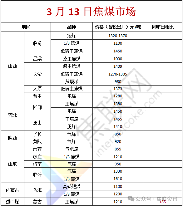 今日国内炼焦煤市场稳中调整运行。供应方面,主流大矿基本正常生产。随着近期期货盘面及成材消费市场好转,市场情绪有所修复,炼焦煤市场流动性转好,降价幅度收窄,线上流拍率走低,部分超跌资源成交出现反弹,高价资源则继续补跌,整体看煤价逐步止跌企稳。价格方面,现山西临汾地区主焦煤(A11、S3.8、G90)上调78元至出厂价1134元/吨,肥原煤(S4、G95、回收35)上调193元至出厂价778元/吨;长治地区瘦原煤(S3、G60、回收50)上调25元至出厂价717元/吨;忻州地区气原煤(S0.9、G60、回收55)下调4元至出厂价612元/吨。需求方面,焦化企业整体开工水平尚可,但补库积极性依然不高,多维持低库存、按需采购的策略,加之铁水产量出现阶段性下滑,对煤价形成压制。但随着两会结束,部分地区环保限产政策略有松动,钢厂生产预期有所改善,对焦煤的潜在需求存在一定支撑。综合来看,预计短期国内炼焦煤市场震荡偏稳运行。蒙煤方面,口岸通关量依旧保持高位,贸易商出货压力犹存,报价以稳为主,实际成交仍需价格优惠刺激,市场整体交投活跃度提升有限。现蒙5原煤主流报价1090元/吨左右,蒙5精煤主流报价1210元/吨。