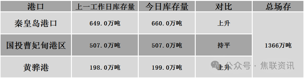 秦皇岛港铁路调入63.9万吨,装船52.9万吨,场存660万吨,锚地煤炭船15艘,预到8艘;国投曹妃甸港铁路调15.1万吨,装船15.5万吨,场存507万吨,锚地煤炭船舶3艘,预到6艘;黄骅港铁路调65.0万吨,装船63.0万吨,场存199万吨,锚地煤炭船舶37艘。