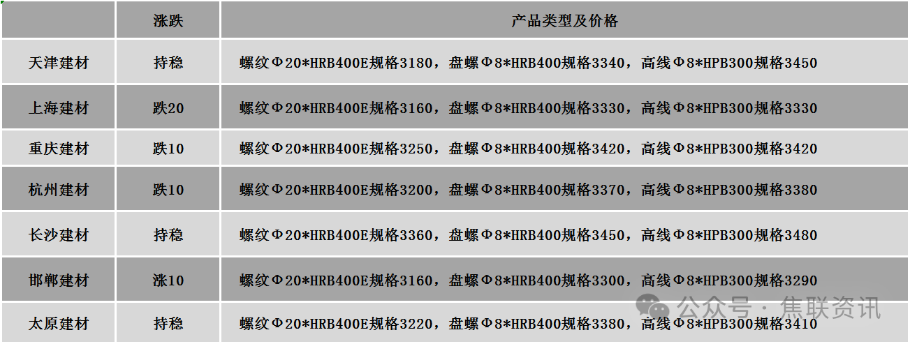 今日钢材价格稳中下跌运行,部分地区下调10-20元/吨。涨跌占比:24个螺纹钢主要地区中,15个地区持平,占比62.5%,9个地区上涨,占比37.5%。原料方面:唐山150*150普碳方坯价格2980元/吨。螺纹钢(HRB400 φ25)均价下跌7元至3448元/吨;高线(HPB300 φ8)均价下跌8元至3604元/吨;热轧卷板(Q235B/SS400 3.0*1500*C)均价下跌5元至3479元/吨;冷轧卷板(ST12/DC01 1.0mm*1250*C)均价下跌3元至3930元/吨;中厚板(Q235B 20mm*2000*L)均价上涨3元至3497元/吨。期货价格:日盘螺纹2605开3148收3140,最高3167最低3135,跌3跌幅0.10%;铁矿2605开816.0收811.0,最高818.5最低806.0,跌1.0跌幅0.12%。钢厂调价:江苏鸿泰螺纹钢下调20;达钢重庆建材下调20。库存方面:本周五大主要钢材品种总库存下降28.66万吨至1946.23万吨,其中社会库存下降12.26万吨至1411.02万吨,钢厂库存下降16.4万吨至535.21万吨。行业数据:1-2月,全国累计生产粗钢16034万吨,同比下降3.6%,累计日产271.76万吨;生产生铁13770万吨、同比下降2.7%,累计日产233.39万吨;生产钢材22119万吨、同比下降1.1%,累计日产374.90万吨。市场方面:美以对伊朗上游石油和天然气方向的攻击,是自冲突爆发以来伊朗能源设施的首次被袭,之后伊朗宣布中东部分国家能源设施将正式成为打击目标,地缘局势进一步升级,霍尔木兹海峡封锁时间预期延长,周四国际油价再度走强。美联储3月议息会议再度保持利率不变,鲍威尔释放鹰派信号,黑色系市场氛围偏空,日盘期钢价格震荡走弱,螺纹主力合约跌0.51%收于3135元/吨,热卷主力下行0.36%至3302元/吨。受期钢盘面走弱影响,现货价格稳中小幅下跌,市场心态不佳,商家报价有所松动,市场低价资源涌现,下游观望氛围较浓,终端需求采购节奏放缓,多以按需采购为主,谨慎下单心态提升,整体成交表现偏弱,预计短期钢价或延续震荡走势,价格涨跌空间有限。