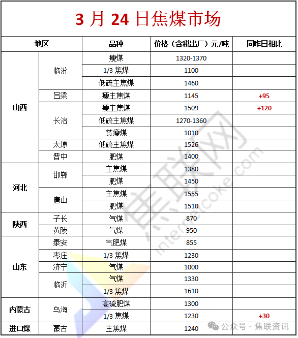今日国内炼焦煤市场偏强运行。供应方面,煤矿多保持正常生产,供应有序释放。伴随多地焦企对焦炭价格开启第一轮提涨,矿方情绪向好,近期焦煤线上竞价无流拍现象,竞拍市场多数煤种溢价成交,加上矿方库存有所去化,出货压力也明显减小,考虑到目前下游采购意愿未减,煤矿仍有继续探涨意愿。价格方面,现山西临汾地区主焦原煤(S2.8、G90、回收39-43)上调17元至出厂价530元/吨;吕梁地区主焦煤(A10.5、S0.9、G85)上调135元至出厂价1603元/吨,主焦煤(A12、S1、G85)上调90元至出厂价1450元/吨,主焦煤(A11、S1.5、G80)上调50元至出厂价1360元/吨,主焦煤(A10.5、S2.5、G85)上调182元至出厂价1414元/吨,主焦煤(A8.5、S1.3、G75)上调45元至出厂价1375元/吨,主焦煤(A10.5、S3.0、G85)上调40元至出厂价1361元/吨,肥煤(A10.5、S1.5、G90)上调50元至出厂价1500元/吨,瘦主焦煤(A7.5、S2.2、G70)上调95元至出厂价1145元/吨,瘦精煤(A8.5、S1.3、G70)上调30元至出厂价1420元/吨,气原煤(S0.9、G55、回收48)上调32元至出厂价500元/吨,气原煤(S1.6、G70、回收40)下调10元至出厂价214元/吨;长治地区主焦煤(A11.5、S1.0、G85)上调90元至出厂价1450元/吨,主焦煤(A8、S0.4、G65)上调120元至出厂价1510元/吨,主焦煤(A9.5、S0.45、G65)上调100元至出厂价1400元/吨,瘦主焦煤(A8.0、S0.5、G70)上调120元至出厂价1509元/吨,贫瘦原煤(A30、S0.5、G11)上调106元至出厂价765元/吨;晋中地区主焦煤(A12、S0.9、G75)上调700元至出厂价1470元/吨,主焦煤(A10.5、S1.3、G80)上调50元至出厂价1450元/吨;忻州地区气原煤(S0.9、G60、回收55)下调7元至出厂价679元/吨,气精煤(A9.5、S0.9、G65)上调23元至出厂价793元/吨。需求方面,焦企开工整体良好,但由于原料成本抬升,整体利润收窄,部分焦企开启焦炭首轮提涨,加之铁水继续回升下,原料刚需较强,短期煤价仍有一定支撑。综合来看,预计短期国内炼焦煤市场震荡偏强运行。蒙煤方面,近期市场询货有所增加,下游开始适当采购,带动部分贸易商对后市情绪提升,蒙煤价格上涨明显。现蒙5原煤主流报价1171元/吨左右,蒙5精煤主流报价1240元/吨。