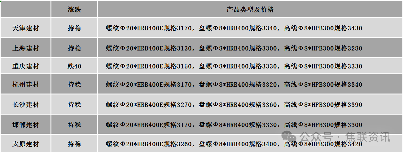 今日钢材价格稳中个调运行,个别地区下跌10-40元/吨。涨跌占比:24个螺纹钢主要地区中,21个地区持平,占比87.5%,3个地区下跌,占比12.5%。原料方面:唐山150*150普碳方坯价格2980元/吨。螺纹钢(HRB400 φ25)均价下跌7元至3438元/吨;高线(HPB300 φ8)均价下跌7元至3586元/吨;热轧卷板(Q235B/SS400 3.0*1500*C)均价下跌4元至3474元/吨;冷轧卷板(ST12/DC01 1.0mm*1250*C)均价下跌3元至3929元/吨;中厚板(Q235B 20mm*2000*L)均价下跌1元至3515元/吨。期货价格:日盘螺纹2605开3120收3114,最高3120最低3097,跌6跌幅0.19%;铁矿2605开802.5收789.0,最高802.5最低785.5,跌11.5跌幅1.44%。钢厂调价:玉溪玉昆、玉溪仙福、云南德胜建材下调40。市场方面:经过一天的威胁,美国时间的周二晚间,美国和伊朗在最后一刻接受停火提议,为期两周。谈判将于4月10日在巴基斯坦首都伊斯兰堡开始。美以伊三方临时停火、亚太股市大涨,国际原油价格大跌,拖累煤焦期货开盘跳水,但当前煤焦估值偏低,市场情绪缓和后,盘中震荡回升,焦煤主力收涨0.99%报1120.5元/吨,焦炭小涨1.05%至1688点;螺纹、热卷主力也是跌后回升,螺纹主力收盘跌0.19%至3114点,热卷微涨0.06%至3282点。螺纹期货震荡飘绿,建材现货价格基本平稳,个别有所调整,商家积极出货变现操作,谨慎观望心态居多,下游用户仍随用随采,谨慎避险情绪较浓。随着中东局势的缓和,市场重回基本面逻辑,考虑到当前需求表现不温不火,钢材库存去化缓慢,价格调整幅度有限,预计短期市场或基本平稳运行为主。