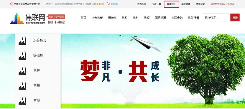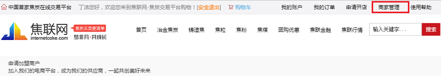 1.登录焦联网首页,点击屏幕上方“申请开店”。