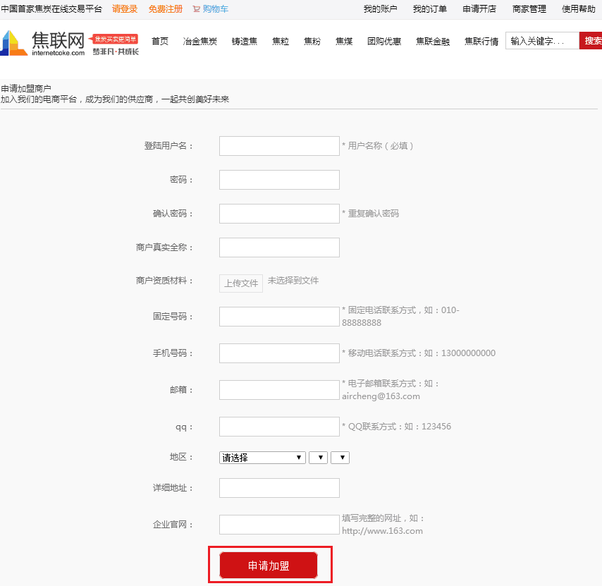 2.进入商家注册页面,根据提示填写企业信息,上传企业资质,填写时务必保证内容真实准确。填写完毕,点击“申请加盟”。我们会在最快时间完成审核,请耐心等待。